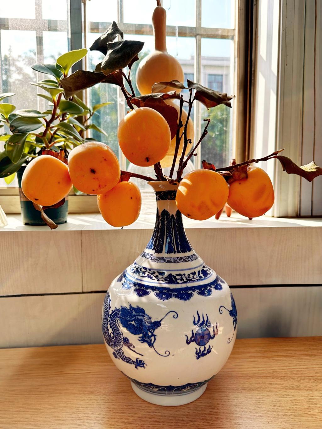 老师们将一个个色泽饱满、形态可掬的柿子精心摆放在办公桌、书架、窗台等处。有的将柿子与书籍、绿植搭配,营造出雅致的工作氛围;有的用篮子或托盘盛放,构成一道亮眼的秋日小品。各办公室内“柿”趣盎然,象征着“事事如意”、“万事顺心”美好寓意的小果实,不仅为严肃的办公环境增添了一抹温暖的亮色和盎然生机,更承载了学院对教职工们的美好祝福。