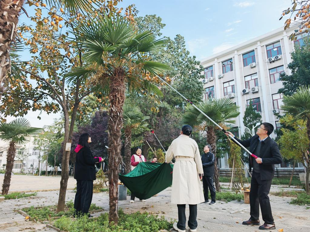 午后阳光和煦,学院楼前的柿子树已是硕果累累,橙红色的柿子如一盏盏小灯笼挂满枝头,成为校园里一道亮丽的风景线。采摘现场欢声笑语,气氛热烈。有的老师手持专用采摘杆,小心翼翼地套住高处的柿子,精准发力,果实便稳稳落入袋中;有的老师则默契配合,一人牵引枝条,一人负责采摘,协作无间。平日里严谨治学的教授、专注科研的学者们,此刻都化身快乐的“采摘工”,在亲近自然的过程中放松了身心,享受着劳动带来的纯粹乐趣。采摘过程不仅是对果实的收获,更是一次心灵的减压与团队凝聚力的升华。