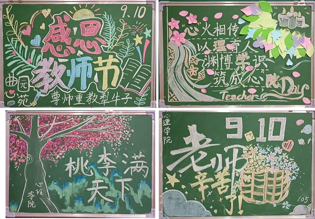 举办“师恩深似海,心语寄长情”庆祝“教师节”黑板报绘制活动。活动中,学院收集来自本科生2020级、2021级和2022级师范生绘制的以“教师节”为主题的黑板报,并将黑板报在学院内外展出。