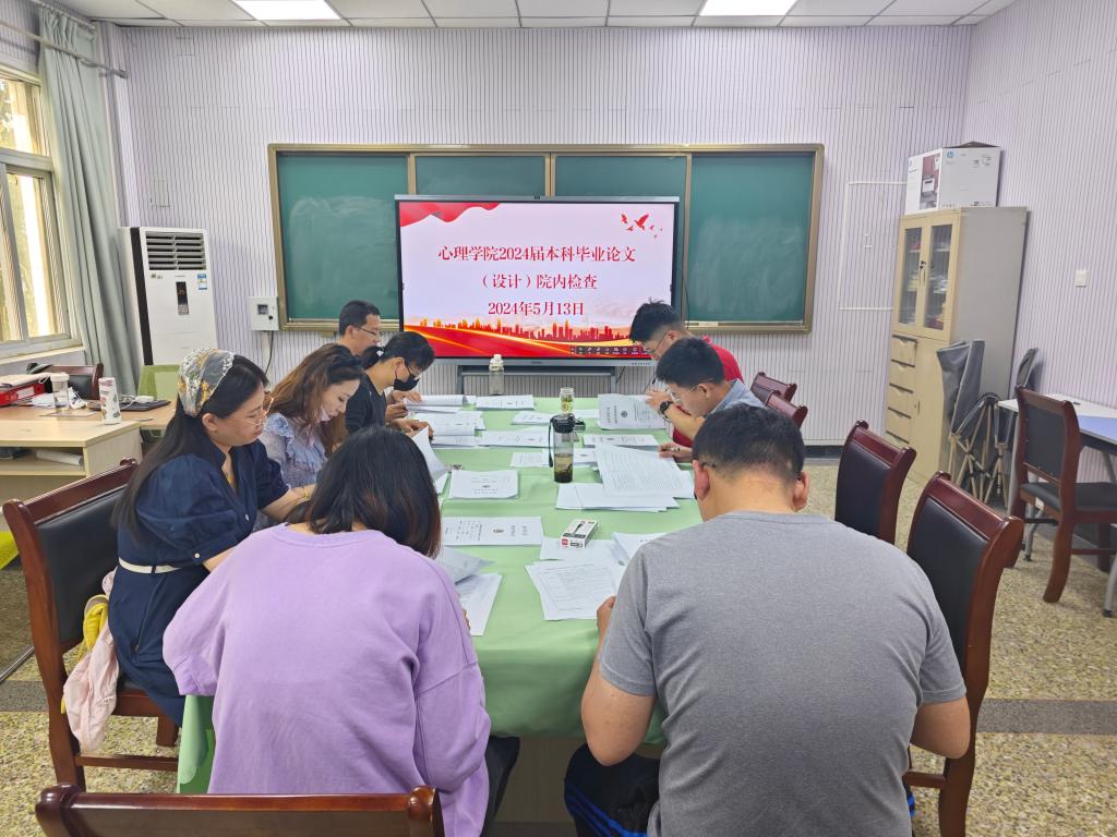 )为进一步做好2024届本科毕业论文(设计)工作,加强毕业论文(设计)过程管理,提升本科毕业论文质量。2024年5月13日,学院组织对2024届本科毕业论文(设计)进行院内检查,共有陈圣栋、周平艳、韩含、杜雅楠、吕邈、杨庆、王修欣、袁光杰8位教师参与了此次检查活动。