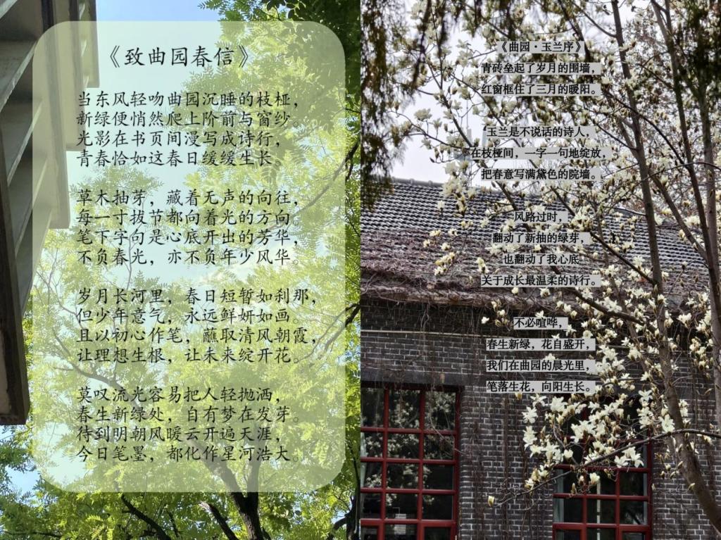 本次活动通过开展春日小诗征集,引导学子发现校园春日之美,不仅展现同学们的文学素养与创作才华,更以诗意方式定格了曲园春日的美好记忆。学子们一字一句写下的诗词,让校园文化在诗词的滋养中更具温度与活力,也为校园文化的传承与发展注入了青春朝气与文学力量。