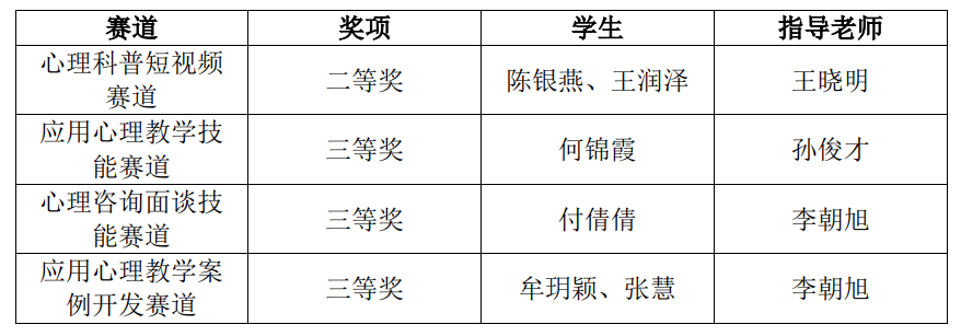 研究生陈银燕、何锦霞、付倩倩、牟玥颖等学生共斩获四个赛道的四个奖项,取得骄人成绩。《正念——帮助你走出生活困境》《探索自我——发现多维的我》《一例学业焦虑研二女生心理咨询案例》《“呵护荆棘中的花朵”—教师干预下离异家庭学生心理成长探索》四个作品分别获得2023年全国应用心理专业学位研究生实践技能大赛二等奖、三等奖。