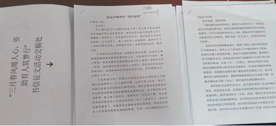 共奔康庄圆大梦,阳光普照九州春。本次书信征文活动让同学们有机会为贫困地区的学子送去温暖,同时在校园营造了互帮互助、乐观好学的氛围。同学们理解了贫困地区同学的辛苦,能够用自己的力量实现助人、自助,更加明确了投身国家建设的“心”理想,踏上了为人民美好生活而学习奋斗的“心”征程。