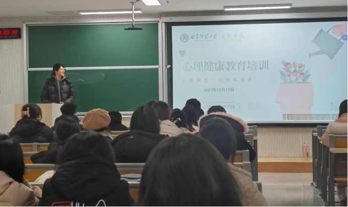 第二届学生会主席,在校期间获校长奖学金、国家奖学金、省优秀学生干部、中国大学生5分钟科研英语演讲比赛全国三等奖等多项荣誉,专业知识扎实、实践经验丰富。在培训过程中,刁子桐首先提出心理委员与心理信息员的职责,并介绍了四级监控网络的相关内容。随后,她强调如何识别大学生常见的一些心理问题,以及大学生心理健康的定义和标准。其次,通过具体的案例分析,刁子桐就常见的心理问题给出应对措施,并特别提醒心理委员和心理信息员及时关注同学们的心理健康状况。最后,刁子桐就心理委员与心理信息员的自我调节与成长做了详细介绍,并提供处理当下情绪、提高负性情绪的产生阈值等有效建议。