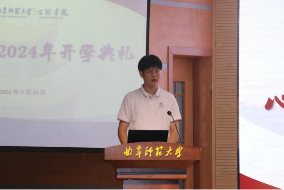 逐梦“心”成长。2024级新生代表李书涵发言。首先她代表全体新生向老师们表示感谢。她对刚刚结束的军训生活做出总结,表示将以饱满的姿态与热情开启未来四年的崭新征途。同时,她用三句诗表达了对大学生活的期望。“少年应有凌云志,万里长空竞风流”,她提出作为初入学的新生,在未来的四年中应树立远大理想,不断提高自己的目标与意志力,以更高的要求和目标审视自己,主动抓住机遇实现自身的发展;“春风浩荡满目新,扬帆奋进正当时”,作为新时代青年应在这个由青年担当的时代,以奋斗书写最美好的青春宣言,奏响时代最强音;“暮去春来心如故,心怀家国耀明烛”,身为心理学专业学生,应发奋图强,努力学习心理学学科专业知识,为推动心理学学科发展贡献自己的力量。