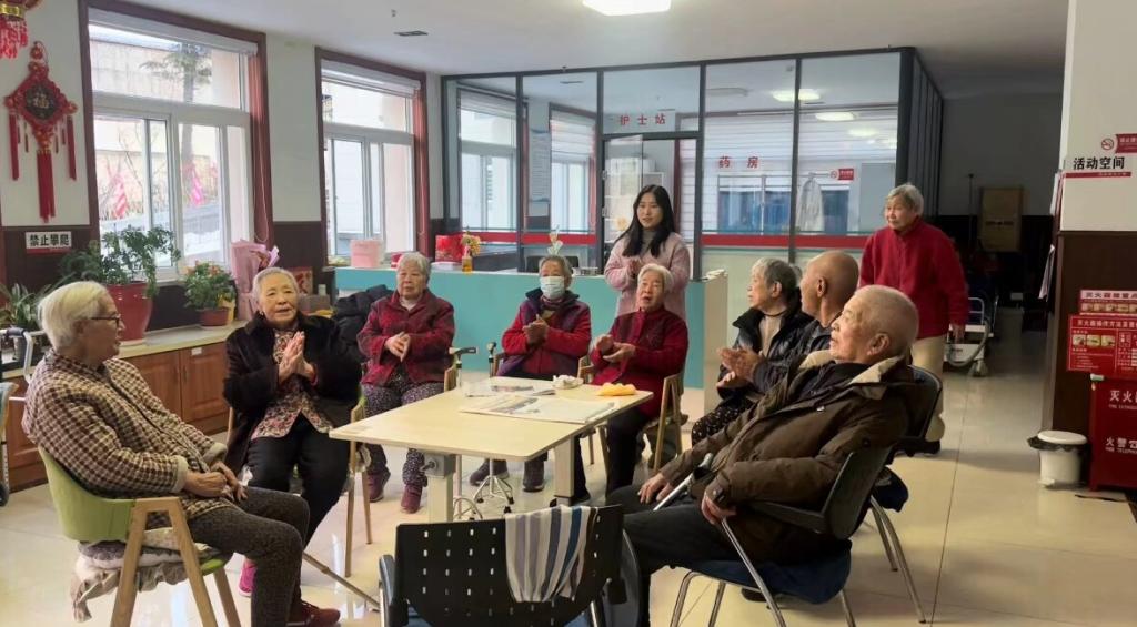 “大厦将倾问栋梁,谁曾播火拓洪荒。”在社会实践队员与养老院老人的交谈中,队员了解到,眼前这些精神矍铄的老人,皆是饱经岁月洗礼、历经风雨的老共产党员,队员们便主动与之互动。队员们兴致勃勃地分享大学《形势与政策》课程内容,从时事热点到发展战略,用通俗话语讲解,老党员专注聆听并分享见解,现场气氛热烈。因部分老人视力不佳,队员贴心为其朗读新闻。交流渐入佳境时,队员提议共唱《没有共产党就没有新中国》。