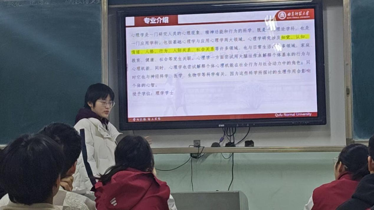 的历史沿革开始,向在场学生展示了学校深厚的文化底蕴。一系列校园风景照片,生动展现了大学校园的美丽与活力,激发了学弟学妹们的向往之情。在介绍学校专业设置的过程中,以心理学为核心,通过列举各专业的特色课程、科研成果以及就业前景,使学生们对大学专业有了更为明确的理解。同时,还介绍了丰富多彩的校园文化活动,包括社团组织的各种竞赛、文艺演出等,让学生们充分感受到大学生活的多元与精彩。