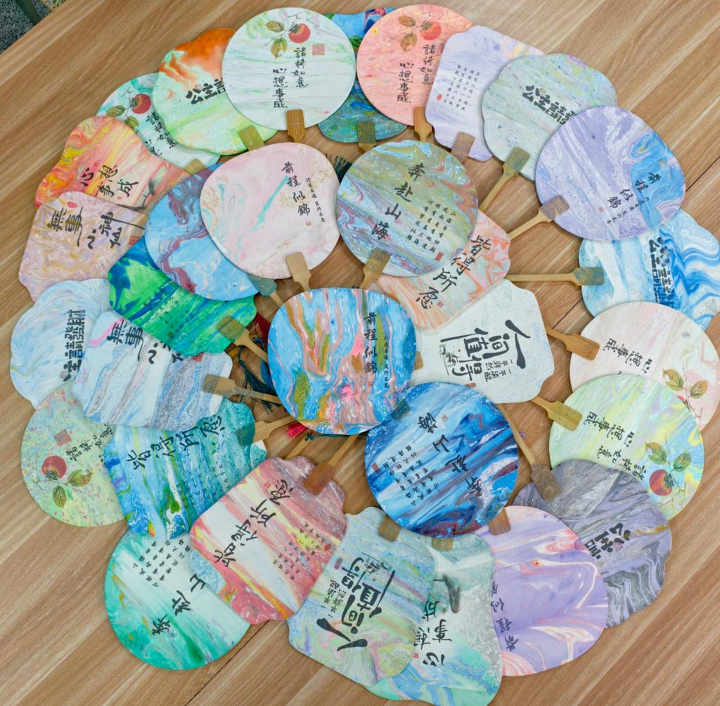 在创作过程中,同学们充分发挥想象力,让每一把漆扇都承载着独特的情感表达。有的同学通过分层滴漆,在扇面上呈现出朝霞般绚丽的渐变效果;有的则运用“留白”技法,以深色漆料勾勒出抽象的符号。