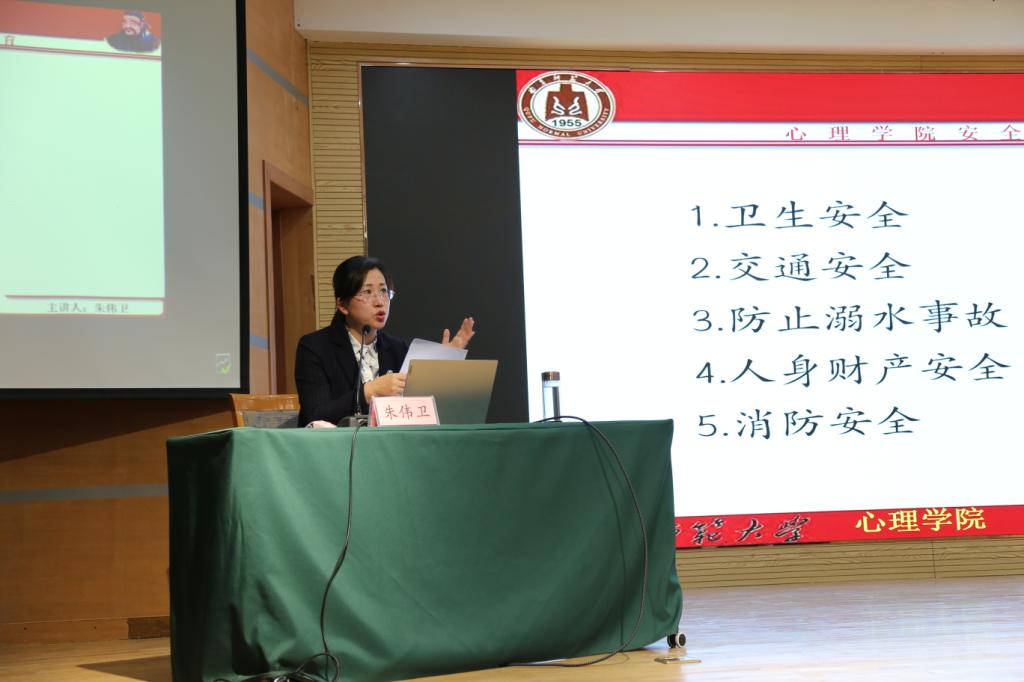 全体本科生参会。本次安全教育大会分为三个板块。首先是安全教育方面,内容包括卫生安全、交通安全、防止溺水事故、人身财产安全以及消防安全,并就具体实例讲述了安全的重要性,以此来警示同学们要切实提高安全意识;其次是心理健康方面,主讲如何正确对待恋爱关系、师生关系、同学关系、朋友关系,合理的解压方式以及明确自己的目标并通过努力达到自己的预期目标等具体问题;最后是网络素养教育,内容主要有网络行为规范、网络安全观念、网络防范意识、预防网络沉迷等几项,并强调在网络高速发达的今天,一定要注意网络安全,在保护自己的同时也要记得规范使用网络。随后,朱伟卫再次向同学们介绍了赌场