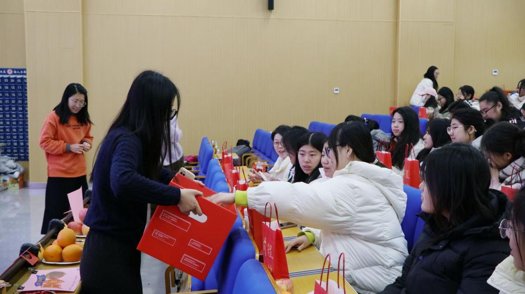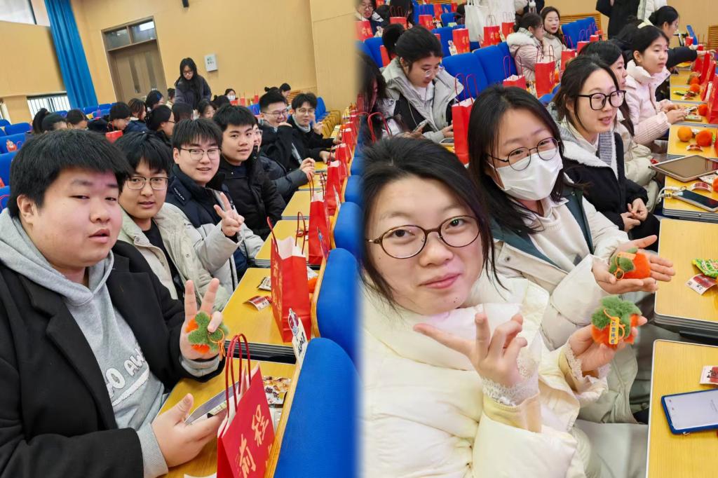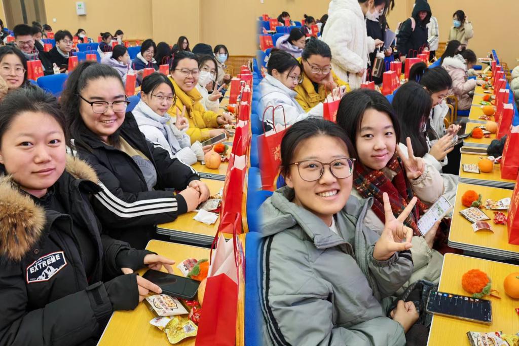 本次加油会紧扣“心向往之 行则将至”主题,鼓励同学们用稳健的心态和扎实的行动逐梦远航。通过暖心礼赠、师长寄语、心语投递等环节,营造温馨鼓舞的氛围。活动现场,“踏者上岸”“一举高粽”的祝福扑面而来,踏一踏、顶一顶的互动寄托着大家的美好期许。“袋来好运”的红色福袋装满了诚挚的祝愿:颗颗饱满的花生,寓意 “好事发生”;圆润讨喜的柿子,象征 “事事如意”;软糯香甜的栗子,期许 “顺顺利利”;金黄饱满的橙子,祝愿 “心想事成”;脆甜多汁的苹果,盼着学子们 “平步青云”。这些满载心意的礼物,是学院对每一位追梦人的祝福。师生手持礼包齐聚一堂,在欢声笑语中留下了定格青春的难忘合影。