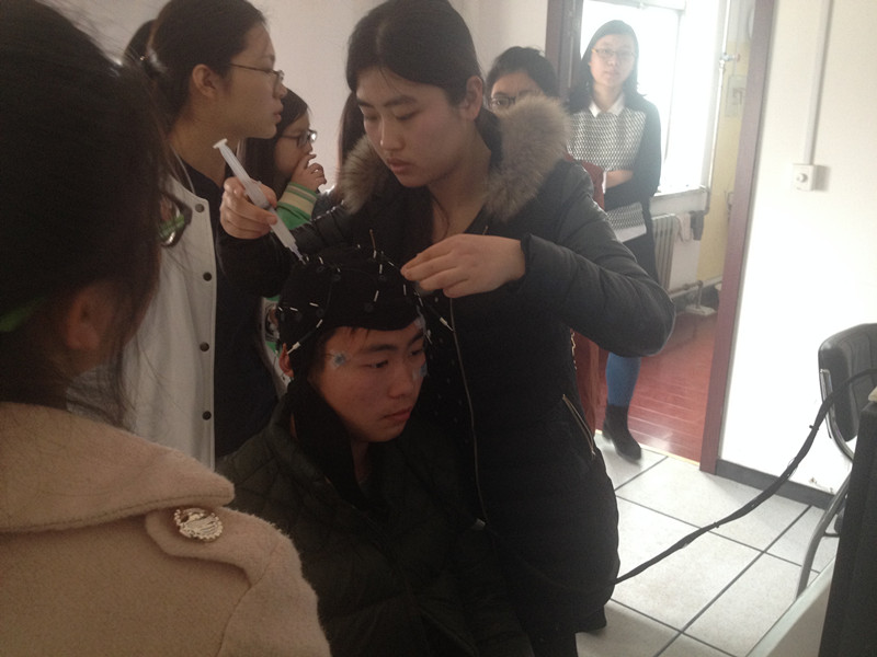 心理学爱好者们首先来到感统训练教室和沙盘活动室,在那里他们知晓了沙盘游戏对于心理治疗的作用。在心理学基础教学实验室,同学们参与了面部表情辨认和空间位置记忆广度实验,在常规仪器实验室同学们操作了镜画仪实验和简单反应时实验。通过趣味性的参与活动,同学们对心理学有了进一步的感性认识。活动的最后一个环节,心理学爱好者们分别观看了眼动追踪和事件相关电位(ERPs)实验的演示。眼动和脑电实验操作流程详细生动的展现,让同学们“亲密接触”了当今心理学最前沿的实验研究技术。