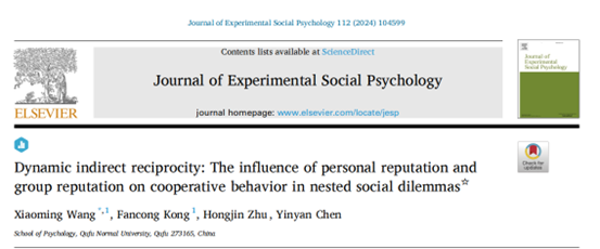 Wang, X.*, Kong, F., Zhu, H., & Chen, Y. (2024). Dynamic indirect reciprocity: The influence of personal reputation and group reputation on cooperative behavior in nested social dilemmas. Journal of Experimental Social Psychology, 112, 104599. //doi.org/10.1016/j.jesp.2024.104599.