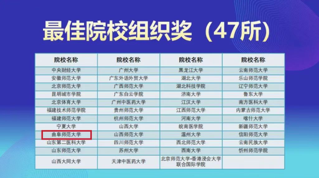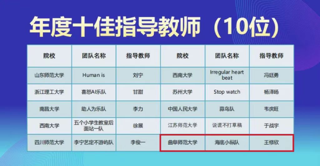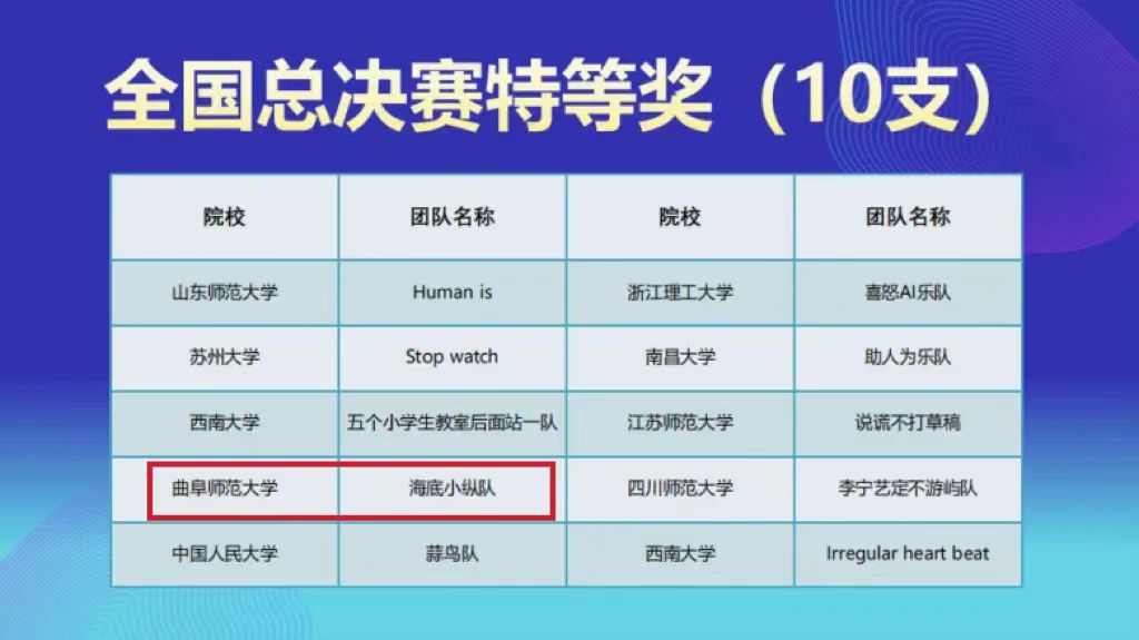 我院共有20支队伍参加校级选拔赛,其中获得校级一等奖的队伍进入分区赛竞赛。在6支队伍晋级分区赛的队伍中,共获得分赛区竞赛一等奖2项、二等奖3项、三等奖1项。其中,获得分赛区竞赛一等奖的“海底小纵队”“家有银珂”两支团队顺利晋级全国总决赛,与来自四个赛区的其他58支队伍展开了激烈的角逐。最终,“海底小纵队”获得全国总决赛特等奖,指导老师王修欣副教授获年度十佳指导教师、优秀指导教师称号;“家有银珂”获全国总决赛二等奖,指导老师王晓明副教授获优秀指导教师称号;曲阜师范大学获得“最佳院校组织奖”。